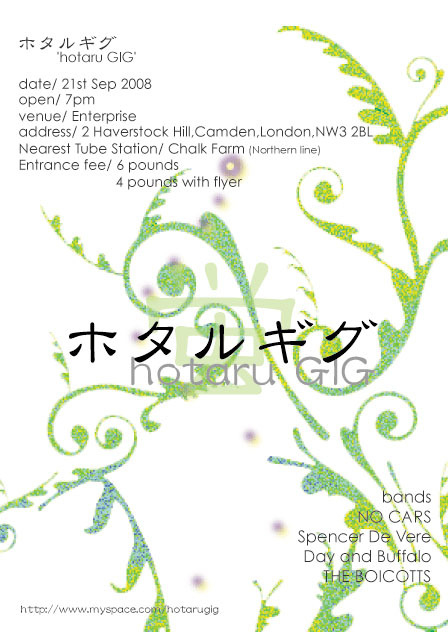 ホタルギグ hotaru GIG date/21st Sep 2008 open/7pm venue/Enterprise address/2 Haverstock Hill,Camden,London,NW3 2BL Nearest Tube Station/Chalk Farm (Northern line) Entrance fee/6pounds , 4pounds with flyer bands/ NO CARS Spencer De Vere Day and Buffalo THE BOICOTTS ロンドンで活動する日本人バンドやネイティブのバンドのライブを中心としたロックイベントです! エントランスは通常は��6ですがこちらのメールアドレス【hotarugig@googlemail.com】お名前とご希望の人数をお書きの上、送信してい