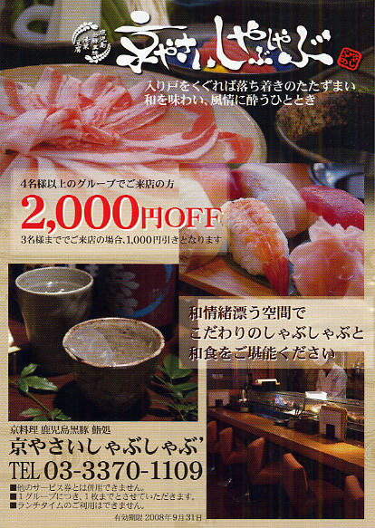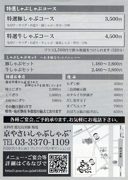 いわずもがな、食欲の秋です! 来週頭ということで、ちょっと開催まで日がないのですが、 今回は牛豚しゃぶ屋でしっぽり、軽めです。 肉は鹿児島産、料理は京風、和食で鮨も握るお店です 月曜開催ですが、翌日は祝日です。 翌日遊ぶ人の為に、2時間でさっくり打ち上げましょうー 4名からの割引券を確保したので、4人集まったら決行です。 2時間のみ放題付きでも3000円〜でお腹一杯食べれます。 飲まない人はもっとお得です。思いっきり食べても 4000円かからないでしょう 例:http://www.hotpepper.jp/A_2