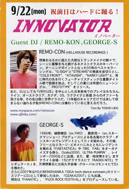 照明、サウンドシステム、映像などパワーアップしたabime 2030では、常に新しいダンスミュージックに目を向けて行きます 中でもこの日は、毎回ゲストを迎えて革新的なスタイルを提案します 新しい刺激を求める方にオススメです abimeが贈るスペシャルイベントです SPECIAL Guest DJ / REMO−CON・GEORGE−S REMO−CON(HELLHOUSE RECORDINGS) 想像をはるかに超えた大胆なトラックメイクの数々で、シーンに衝撃を与え続けるネクストクラスの