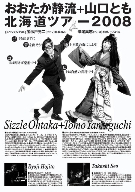 ゴミを出さずに音を出そう! 地上を歌の森にしよう! ゴミは叩けば楽器です。 ヒトは自然の音符です。 七色の声を操る無国籍ノンジャンル・シンガー:おおたか静流と、 ガラクタに命を吹き込む打楽器奏者:山口とも。 NHK教育テレビなど多彩な活動で知られる二人による ハイパー・スペクタクル・ミュージック! 【出演】 おおたか静流 (シンガー&ボイス・アーティスト) 山口とも(日本廃品打楽器協会会長、打楽器奏者、写真家) <スペシャ