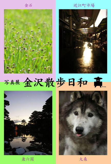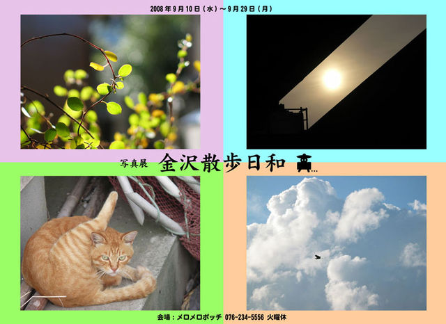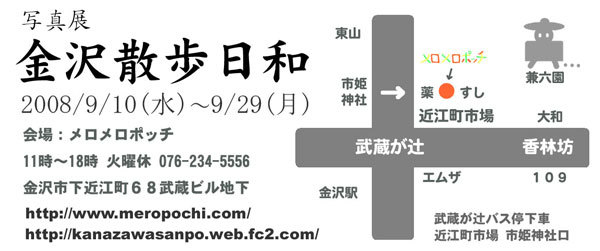 金沢をママちゃりで散歩しながら撮った写真を展示しています。 写真展『金沢散歩日和』 http://kanazawasanpo.web.fc2.com/ 2008年9月10日(水)〜2008年9月29日(月) 会場は金沢の台所近江町市場内にあります喫茶店「メロメロポッチ」さんです。 http://www.meropochi.com/ 11:00-18:00(火曜日定休) 076-234-5556 ・(車で行く場合は)今は無き旧ダイエーの100円パーキングに駐車 ・近江町市場に「市姫神社口(旧ダイエー口)」から入ると左手入り口付近 ・「薬のキリン堂」と、「山さん寿司」の間の階段を降りる 入場無料です!