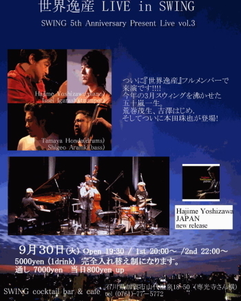 『世界逸産=吉澤はじめGROUP 』 9月30日(火) Open 19:30 / Start 20:00〜 / 22:00〜 SWING 5th Anniversary Present Live vol.3 五十嵐一生(tp) 荒巻茂生(bass) 吉澤はじめ(piano) 本田珠也(drums) 5000yen (1drink) (1・2stage 通し7000yen)当日800yen up ついに『世界逸産』フルメンバーで来演です!!!! 今年の3月スウィングを沸かせた五十嵐一生。 荒巻茂生、吉澤はじめのアルバムリリース・ツアー の意味もあります♪そしてついに本田珠也が登場! 数年前にこの南加賀にこれほどのライブの選択肢があったでしょうか?(T_T)