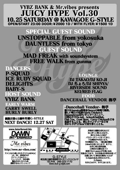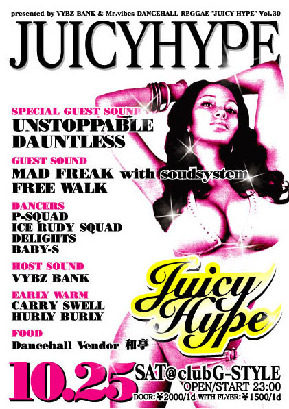 告知失礼致します!! VYBZ BANK & Mr.vibes presents DANCEHALL REGGAE 『JUICY HYPE Vol.30』 2008.10.25(SAT)@川越G-STYLE OPEN 23:00 ADM MEN:2000yen/1D WOMEN:1500yen/1D -SPECIAL GUEST SOUND- UNSTOPPABLE DAUNTLESS -GUEST SOUND- MAD FREAK with SOUNDSYSTEM FREE WALK -HOST SOUND- VYBZ BANK -EARLY WARM- CARRY SWELL HURLY BURLY -DANCERZ- P-SQUAD DELIGHTS ICE RUDY SQUAD BABY-S -LOUNGE- (HIP HOP)DJ TAKAO / DJ チョロ / DJ KO-JI (REGGAE)RIVE