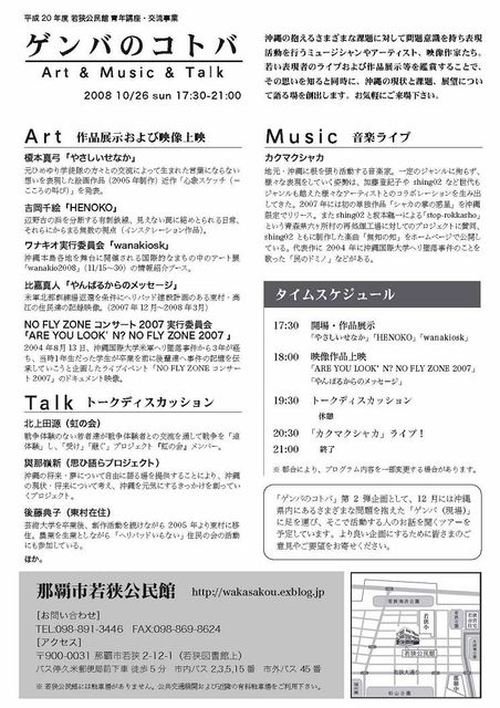 沖縄の抱えるさまざまな課題に対して問題意識を持ち表現活動を行うミュージシャンやアーティスト、映像作家たち。若い表現者のライブおよび作品展示等を鑑賞することで、その思いを知ると同時に、沖縄の現状と課題、展望について語る場を創出します。お気軽にご来場下さい。