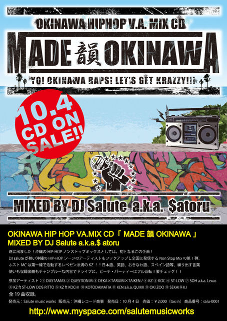 DJ Salute が熱い沖縄の HIP-HOP シーンのアーティストをフックアップし全国に発信する待望の第 1 弾!!ホスト MC は第一線で活動するレペゼン糸満の KZ!!日本語、英語、おきなわ語、スペイン語等、繰り出す言葉使いも収録楽曲もチャンプルーな内容でドライブに、ビーチ・パーティーにフル回転!要チェック!!