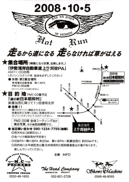 あ、どーも! ̄O ̄)ノオッス 久しぶりにまたmixiに帰ってきた管理人のボクです まぁ〜アレだ HOTRUNに行きましょうよ ★集合時間★ 豊明ポルト http://www.mapion.co.jp/c/here?S=all&F=mapi4125875080930222057 AM8:30集合 AM8:45出発 (ETC割引きを使いたい俺とコージのわがままでかなり早い設定になっとりま) 刈谷ハイウェイオアシス http://www.mapion.co.jp/c/here?S=all&F=mapi4430846080930222347 AM10:00集合 AM11:00出発 (下道で来ると高速に入れませんの