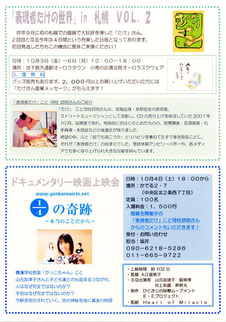 「どさんこ増販塾」管理者イチジョウマンさんのご好意により、イベント及びドキュメンタリー映画上映会のご案内をさせて頂きます。 「表現者たけの世界」in札幌 Vol.2 のご案内 昨年9月、札幌で初の個展が大好評を博しました「たけ」こと河村武明さんの個展が、今年は内容もバージョンアップして開催されることとなりました。 私は昨年の個展に行った事や「たけ」さんとマイミクということもありまして、ボランティア主催者の「パル」こと坂井美樹さんより、今回の個展PRに協力をして頂けないかと言う