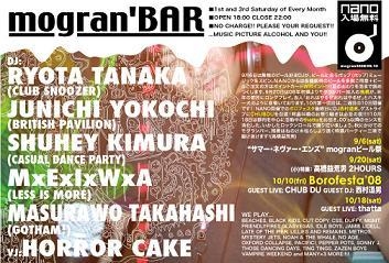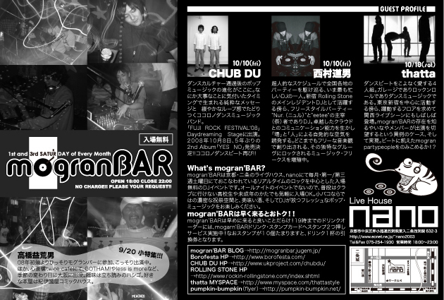 「祭」とは、神霊などを祀る儀式のこと。祭礼もしくは祭祀とも呼ばれる。また、それに伴う催事を含んで「祭」とされる場合もあり、神霊などを祀る儀式と関わりのない催事のみを「祭」と称する場合もある。また、「祭」は、語としては日本古来の祭を指す歴史が長いが、世界各地で行われる同様の行事にも訳語として用いられる。日本の祭について英語で紹介する場合「フェスティバル」が訳語として用いられる。 豆知識はこの辺で!さてさて、今回のモグランバーはボロフェスタ祭!!!GUEST DJに西村道男!!GUEST LIVEにCHUB DU!!を迎えガツンッ!