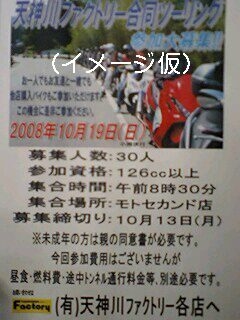 天神川ファクトリー合同ツーリング第2弾!! 第1弾ツーリングから4ヶ月…遂にまた、天神川ファクトリーのツーリングが開催されます!! 東舞鶴を目的地とし、スタッフの方々と常連さん方で仲良く楽しくライティングしましょう♪☆ りば亭の方々はもちろん強制参加でしょー!?(笑) 特に赤レンジャーさんは体調管理に気を付けて必ず参加して下さいねっ♪(関係者一同) 皆様、日にちが5日やったのが19日にズレているのでスケジュールの確認を! 受付はまた後ほど、各店にて♪と言うよりりば亭にて!! 募集人数:30人 参加資格:126cc以上 集合時間:午前8