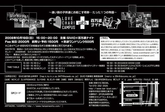 LOVE CHARI CAMPUS with 百万遍ナイト 〜遠い国の子供達にお起こす奇跡… たった1つの物語〜 2008.10.19 [SUN] 時間:15:00〜20:00 場所:京都クラブBOWL 前売り:¥1500/当日:¥2000 2007年7月 僕達はーラオスの小学校のない村に小学校を建設するーという壮大なプロジェクトを開始した。 そして・・・ 2008年9月 ラオスのある村にSIVIO小学校を建設することに成功した。 でも・・・ 僕達はこれで終わりじゃない!! 2008年10月19日 SIVIOと百万