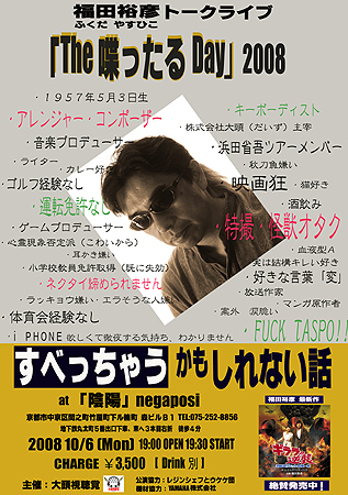 福田裕彦トークライブ 「THE喋ったるDAY 2008」 ★すべっちゃうかもしれない話★ 現・浜田省吾ツアーメンバーのキーボーディストであり、 日々、マルチな活動を展開中の 福田裕彦さんのトークライブが 京都のライブハウス「陰陽 NEGAPOSI」で実現します! 当日は気になるあんな話やこんな話しが直に聞けるかも!? モチロンシンセサイザーの演奏もアリ! 更にあまだ省吾のゲスト出演も決定しました! 月曜だからなぁ〜 なんてこの機会を逃さないでくださいね! チケットは