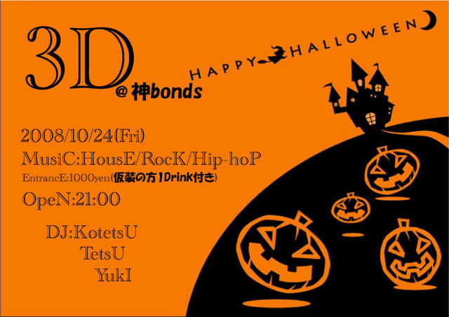 やってきました!!!今年もハロゥイン★ 今回で第三回になります・・・・ 今回も仮装(コスプレ!????)の方1Drinkつけちゃいます。。。 open:21:00 entrance:1000yen(仮装してきた方1drink) music:HOUSE.R&B.hip-hop////etc DJ:TETSU YUKI こてつ 仮装してこないと・・・・逆に浮いてしまうこのイベント!!! 去年はえらいことになってました・・・・・ コスプレ大好き集まれ!!!! みんなホントはコスプレ好きなんでしょ!? さて今年のハロゥインもどうなることやら・・・・・ おた