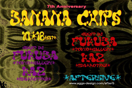 BANANA CHIPS 7th Anniversary 2008.10.18(sat) 21:00 open ADV\2500(1d) DAY\3000-with fryer\2500(1d)- -GUEST DJ- FUKUBA/Gallery@Tokyo KAZ/Mother -DJ,VJ&STAFF- K-CO YOSHIKO SHOW KEN-ONE YU:KO -SOUND DESIGN- ☆KAZ(MOTHER) House,Dance Classics,Soul,Jazz,R&B,Latin... ...It's Soulife Music... 【関連コミュ】 DJ.FUKUBA http://mixi.jp/view_community.pl?id=119358 BANANA CHIPS http://mixi.jp/view_community.pl?id=1780314