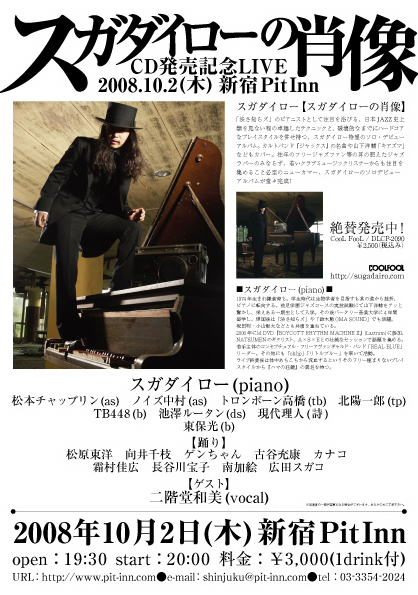 10/2『スガダイローの肖像』CD発売記念ライブ@新宿PIT INN 出演メンバーは、アルバムのレコーディングに参加した三度笠フリー・ジャズ・ユニット「Real Blue」、「Little Blue」のほか、ゲスト・ヴォーカルに二階堂和美さんが参加します! どサイケデリックな狂宴の一夜となること、間違いなし! 2008年10月2日(木) 新宿 PIT INN (http://www.pit-inn.com) open 19:30 start 20:00 charge:¥3000(+1drink) 新宿 PIT INN 03-3354-2024 出演: スガダイロー(pf) 松本崇史(as) ノイズ中村(as) トロンボーン高橋(tb) 北陽一郎(tp