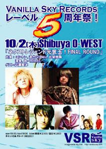 Vanilla Sky Recordsレーベル5周年祭 08年一大祭り@Shibuya O-Westだ 今年最大のイベントに、兎に角全員大集合!盛り上がって行くぜ!! ★☆★☆★☆★☆★☆★☆★☆★☆★☆★☆★☆★☆★☆★☆★☆★☆ 【10/2(木)Shibuya O-WEST】 「ネクストレジェンド元気玉!FINAL ROUND」 出演:ヨシケン、達也GENM