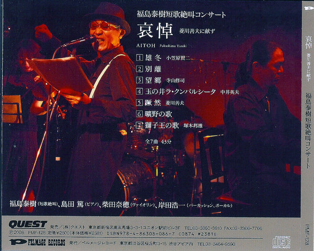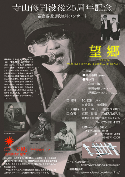 福島泰樹 短歌絶叫コンサート 寺山修司没後25周年記念「望郷」 〜CD「哀悼-菱川善夫に献ず-発売記念ライブ 出演 福島泰樹(短歌絶叫) 青い花【島田篤(ピアノ) 柴田奈穂(ヴァイオリン) 岸田浩一(ギター・パーカッション)】 福島泰樹、1943年東京下谷に生をうけ、「歌謡の復権と肉声の回復」をスローガンに、70年より短歌朗読ステージを開始、「短歌絶叫コンサート」という新たなジャンルを創出。自作の短歌のほかに、中原中也、寺山修司、中上健次などの短歌や戯曲などを35年以上にわたり絶叫。それは本の