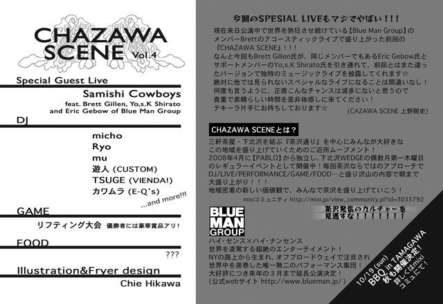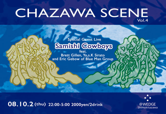 告知失礼いたします。 管理人様、内容が不適切でしたら、お手数おかけしますが削除して下さい。 Brett Gillen氏率いるSamishi Cowboysがまた『CHAZAWA SCENE』に参戦します☆ 『CHAZAWA SCENE』 ■10.2(thu) ■22:00〜5:00 ■\2000/2drink ■@下北沢WEDGE 【SPECIAL LIVE】 Samishi Cowboys,feat.Brett Gillen,Yo,s.K Shirato,and Eric Gebow of Blue Man Group タカチャ 【DJ】 micho Ryo MU 遊人(CUSTOM) TSUGE(VIENDA!) カワムラ(E-Q's) Dai-chin 【GAME】 リフティング大会(優勝者には