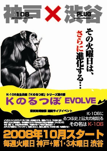 10月よりついに東京、神戸同時開催「Kのるつぼ EVOLVE」がスタートします! その記念すべき東京第1回ゲストは 「B:RIDGE style」 K-106に負けず劣らずすばらしいバンドです。 これから東京での「Kのるつぼ」神戸に負けないくらい盛り上げていきましょう!! ------------------------------------------------------------------------- 2008.10.02(木) 「Kのるつぼ EVOLVE」 adv.\2000(+1D) / door\2500(+1D) OPEN / START 19:00 / 19:30 imfo shibuya PLUG 03-5428-9188 http://www.shibuya-plug.tv/top