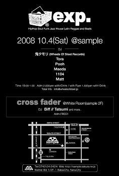 明日です 前回ご好評頂きましたイベント、[exp.]のvol.2を開催致します。皆様ぜひ遊びに来て下さい。 [exp.] HipHop Soul Funk Jazz House Latin Reggae and Beats '08 10.4 (Sat) @ sample DJ 鬼タモリ(Wheels Of Steel Records) Tora Pooh Maeda 1104 Matt Adm \2,000 with 1Drink / with Flyer \1,500 with 1Drink Total Info info@wheelsofsteel.jp [cross fader]@White Room(sample 2F) DJ Biff//Tatsumi and more..