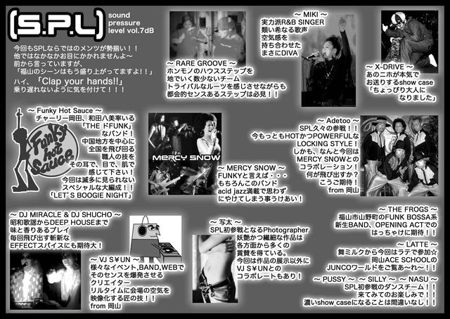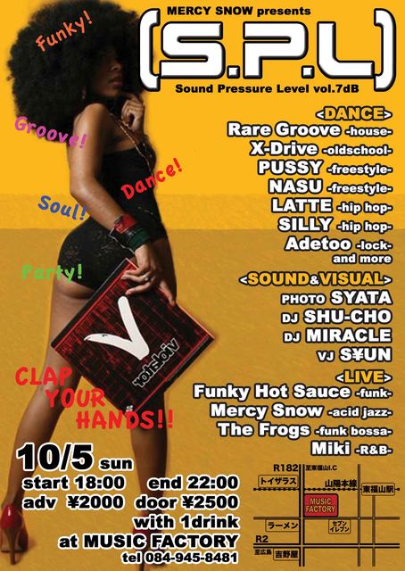 タイトルで「ピクッ」っときた方は要注目 生のBAND 生の歌声 生のDANCER そしてDJ. VJ. PHOTO でお送りする4時間限りの 「GROOVE PARTY!!」 今回で7回目となるSPL 県内でも数少ないacid jazzバンド 「the band of MERCY SNOW」 を始め 岡山からlock danceのカリスマ 「ADETOO」+「南国」 等々生のGROOVEを体感したい方は要チェック!!! 出演者詳細は↓ ↓ ↓ http://mixi.jp/view_diary.pl?id=919702934&owner_id=2412004 をチェック!! チケット残り僅か!! お問い合わせは 福山MUSIC FACTORY 084-945-