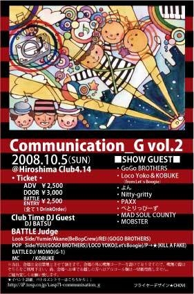 2008.10.5(SUN) @hiroshima CLUB414 OPEN13:00 CLOSE21:00(予定) TICKET ADV/2500YEN DOOR/3000YEN BATTLEENTRY/2500YEN (共に1DRINKオーダー) CLUB TIME DJ GUEST/DJ BATSU JUDGE LOCK SIDE Yumie(GGB FAMILY)/AKANE(BEBOP CREW)/REI(GOGO BROTHERS) POP SIDE YUU(GOGO BROTHERS)/LOCO YOKO(Let's Boogie)/P→☆(KILL A FAKE) SHOWGUEST GOGO BROTHERS LOCO YOKO(from Let’s boogie)&KOBUKE よん(YOSH&YUN) Nitty-gritty MAD SOUL COUNTY(from 仙台) PAXX ぺとりっぴーず MOBSER BATTLE DJ MOMO(G-1) MC KOBUKE