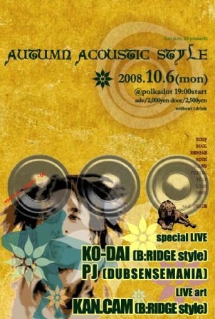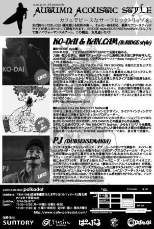 管理人様告知失礼いたします。 ■10.6(mon)■ a.m.p.m. vol.24 AUTUMN ACOUSTIC STYLE 【time】 19:00〜 【door】 前売 2,000yen 当日 2,500yen (要 1drink代別途) 【janle】 SurfRock, Reggae, Dub, etc... 【Guest Live】PJ (DUBSENSEMANIA) KO-DAI (B:RIDGE style) 【Live Art】 KAN.CAM (B:RIDGE style) まだ終わってほしくない夏を想う初秋の夜…。 そんな一夜を彩る、豪華なアコースティックライヴがポルカドットにて開催されます。 DUBSENSEMANIA×B:RIDGE style のソウルフル