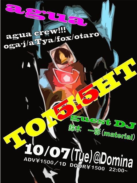 ★☆agua presents『TONIGHT 5.5』★☆ 〜indie,electro,fidget house and more 2008/10/7(tue) @ cafe domina(旧:club daughter) http://cafe-domina.com/ start 22:00 adv.\1500(w/1d) door:\1500 Guest DJ:鈴木一彰(material) DJ:agua crew!!! oga-j / aTya / fox / otaro <info.> ※agua http://www.agua-web.jp/ ※material 052-261-5066