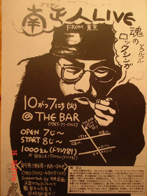 南正人 1944年東京生まれ。’64メキシコに渡航。アメリカ、ヨーロッパを二年間放浪。60年代後半より歌い始める。71年日本ロック界の金字塔となるアルバム(回帰線)を発表。その後時流にくみしない孤高のシンガーとして独自の音楽活動を展開。(‘88命の祭り)を実現させる。(‘97、‘02命の祭り inチェンマイをタイで開催)日本各地のフェスティバル、ライブハウスから個人の家まで、年間100本を越すライブ活動を行い、愛、平和、いのち、地球、未来を開くヴィジョン、、、を唄に乗せて、ギター片手に旅を続けている。‘05に