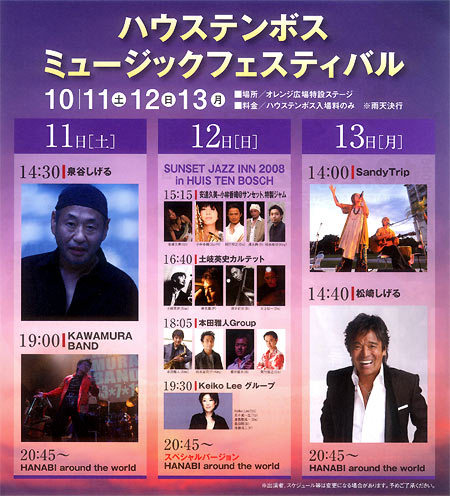 10/8(水)『胡桃の中の世界』 『胡桃の中の世界』vol.2 ● 場所:福岡 PUBLIC SPACE 四次元 ● 出演:青/アンチムジカ/ANTENAINYOU2/とんちピクルス/nomson-folkestra/響子/SandyTrip ● 時間:OPEN/18:30 START/19:00 ※SandyTrip出演22時〜予定 ● チケット:前売1,500円/当日2,000円(+1ドリンク) 10/13(月)『ハウステンボスミュージックフェスティバル』 ● 場所:スパーケンブルグ地区オレンジ広場内特設ステージ ● 出演:松崎しげる/SandyTrip ● 時間:14:00〜 ● チケット入園料:大人3,200円 中