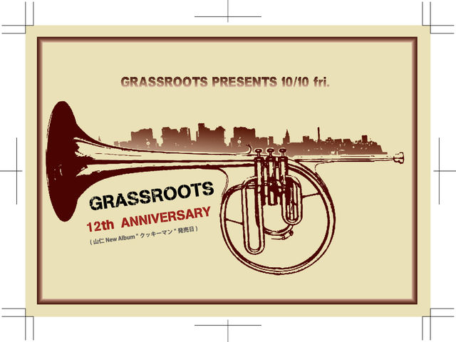 管理人様、告知失礼します。 『10/10 fri 横浜GrassRoots12th.AnniversaryParty!!』@Thumbs UP Open18:30 Stasrt19:00 オールナイト ADV3000円 Door3500円 チケットはGrassRoots店頭の他、ThumbsUpでも取り扱います。 Live: ■山仁 (Album "クッキーマン"発売日)&SAGARAXX http://yamajindasportsman.com/ SAGARAXX http://www.sagaraxx.com/ ■So-ill (SOIL&"PIMP"SESSIONS) http://www.jvcmusic.co.jp/soilpimp/ ■Dachambo http://www.dachambo.com/pc_index.html ■Freaky Machine http://www.freakym