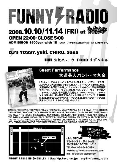 10月10日(金)@ club STOMP OPEN 22:00- CLOSE 05:00 ADNISSION:1500 W/1D *FUNNY Tシャツ着用の方は500yen OFF なんだぜ? Guest Performance : 大道芸人 パント・マネ金 DJ's : YOSSY. yuki. Sasa. ちる LIVE : 空気グルーヴ FOOD : すず&まぁ 今回はFUNNY BBQに来れなかったボス-YOSSYがまたまた大暴れ!?の巻なんだぜ!! club STOMP 大阪市中央区東心斎橋1-13-32宝ビルB1F TEL/FAX 06-6245-0889