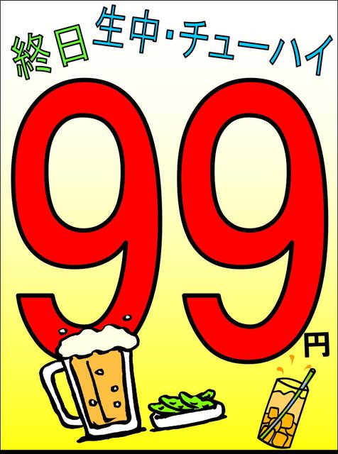 管理人さんまたしても・・・ ありがとうございます!お邪魔します! 秋祭りです @@@@@@@@@@@@その壱@@@@@@@@@@@@ 生ビールは夏だけではありませんぞ 皆様の期待にお応え致しましょう 99円祭 10/10(金)・11(土)の2日間 なななななんと 何杯飲んでも終日 生中&チューハイが(一部除く) 1杯99円(税抜) ソフトドリンクは1杯199円(税抜)