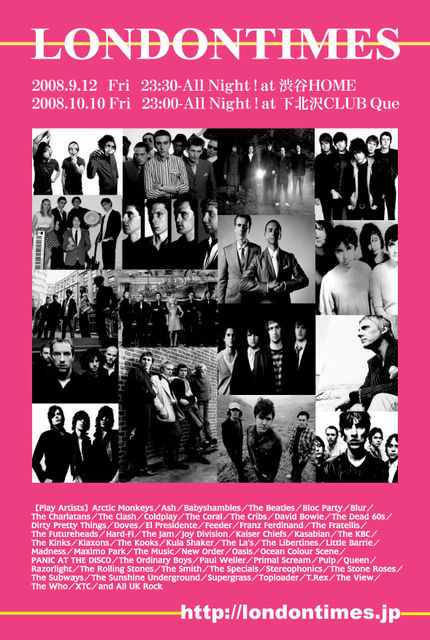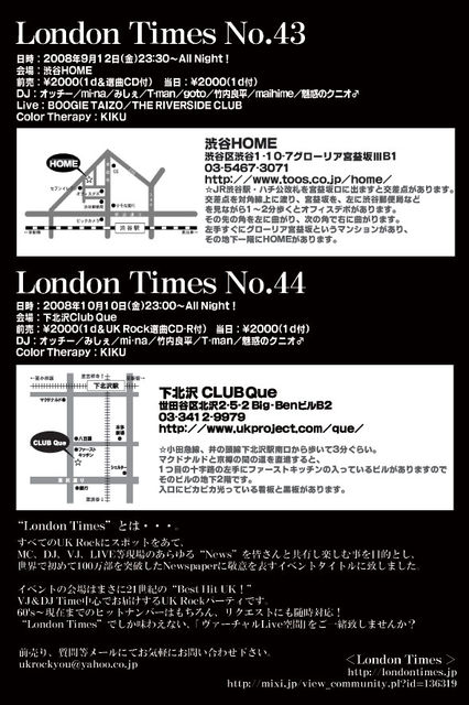 秋の下北開催のお知らせです! “London Times No.44” 日時:10/10(金)23:00〜All Night! 会場:下北沢Club Que 03-3412-9979 住所:世田谷区北沢2-5-2 Big-BenビルB2 http://www.ukproject.com/que/ ※下北沢駅南口から徒歩3分。 マクドナルドと京樽の間の道を直進。 一つ目の十字路の左手に、 ファーストキッチンのあるビルのB2が、 『Club Que』です。 前売:\2000(1d&UK Rock選曲CD-R付) 当日:\2000(1d付) ※質問等こちらでお気軽にお問い合わせ下さい。 ukrockyou@yahoo.co.jp DJ:オッチー/みしぇ/