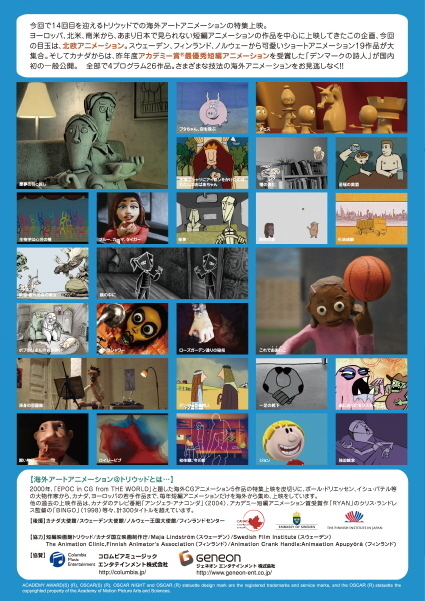 短編専門映画館トリウッドでおこなう、北欧&カナダのアートアニメーション特集を紹介させてください。 ★会期:9月13日(土)〜10月10日(金) ★劇場:下北沢トリウッド http://homepage1.nifty.com/tollywood/index.html ★見どころ: 今回で14回目を迎え、1万人を動員してきた、トリウッドでの海外アートアニメーションの特集上映。 ヨーロッパ、北米、南米から、あまり日本で見られない短編アニメーションの作品を中心に上映してきたこの企画、今回の目玉は、北欧アニメーション。 スウェーデン、フィンランド、ノルウェーから、シュー