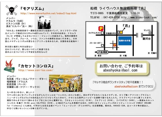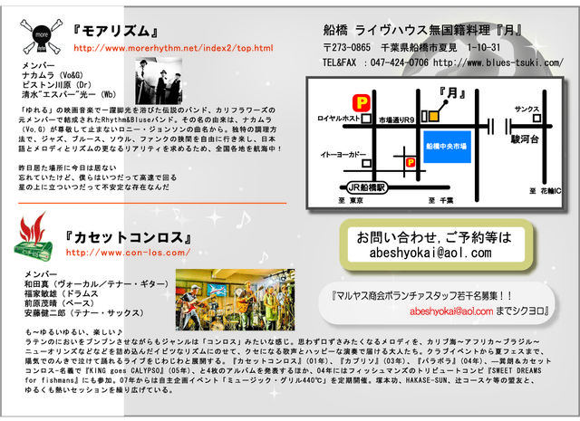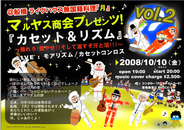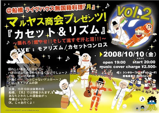 告知失礼します。 前回スモーキンブギでの企画第一弾も好評に終わった マルヤス商会が今回はモアリズムにカセットコンロスとゆう顔ぶれで 千葉は船橋にて開催致します。 10/10(金) マルヤス商会プレゼンツ vol.2 『カセット&リズム』 〜揺れろ!燃やせ!!そして流すぞ汗と泪!!!〜 @船橋 ライヴハウス無国籍料理『月』 http://www.blues-tsuki.com/ open 19:00 start 20:00 music cover charge \2.500- LIVE モアリズム http://www.morerhythm.net/index2/top.html カセットコンロス http://www.con-los.com/ dj シ