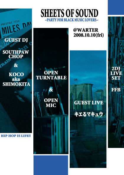 管理人様、告知失礼いたします。 良質なHIPHOP、リアルなHIPHOPを追い求める方は是非!!!!! ディスカウントとりますので、メッセージ下さい。 WARTER present’s SHEETS OF SOUND 2008.10.10(Fri) 23:00開場 ジャンル:HIPHOP CLASSICS,HIPHOP UNDERGROUND,FUNK,JAZZ,SOUL,etc... ここ柏に新たなシーンを築き、全国に発信すべくして集まった、?SHEETS OF SOUND CREW?。柏近郊のBLACK MUSIC LOVERSから絶大な人気を持ち、高いクオリティと驚きの客演で、コアなHIPHOPファンを常にうならせ続けている彼ら。そんな彼らが今回迎える