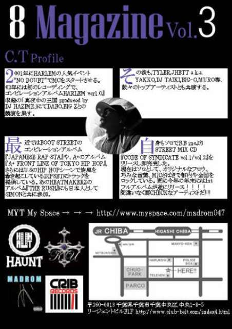 管理人様、告知失礼致します。 不適切な場合、お手数お掛け致しますが削除願います。 2008/10/10(金) HIPHOP,R&B 『8Magazine』 OPEN 22:00- GUEST LIVE: ■C.T LIVE: ■Y氏 ■MYT ■PREDETORE ■BACCHUS ■一間 and more... DJ: ■SHINTARO ■SHINYA ■GLORY ■ROCK ■Y−DORO ■FunYuU and more... DANCE: ■KUROMON ENTRANCE FEE 当日:2,000yen フライヤー持参:1,500yen 千葉CLUB-B