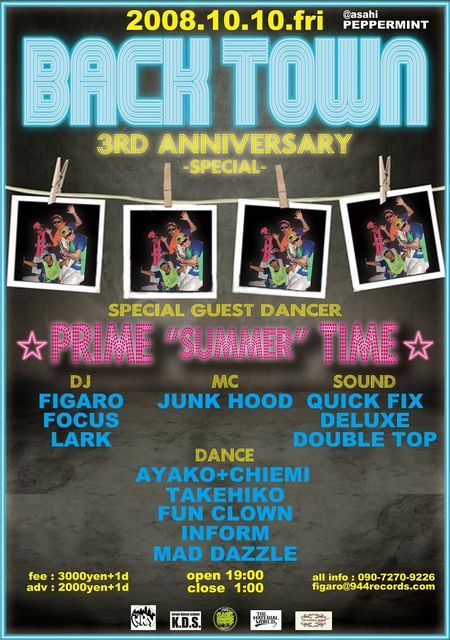 管理人様告知失礼致します。 不適切であれば、削除お願いします。 --------------------------------------- 2008/10/10(fri) "BACK TOWN -3rd anniversary special !!!-" @ asahi PEPPREMINT open 19:00 close 1:00 fee:3000yen+1d adv:2000yen+1d 【Special Guest Dancer】 PRIME "summer" TIME 【dj】 FIGARO FOCUS LARK 【sound】 QUICK FIX DELUXE DOUBLE TOP 【dance】 AYAKO + CHIEMI TAKEHIKO FUN CLOWN INFORM MAD DAZZLE 【live】 JUNK HOOD --------