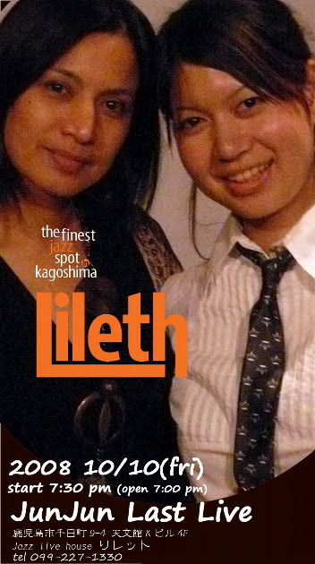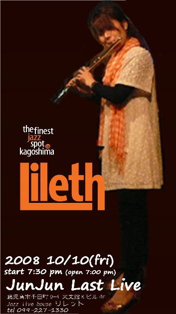 昨年11月より当店のスタッフとして頑張ってくれたジュンコさんですが、 10月10日を持ちまして、スタッフを辞めることとなりました。 その最後の夜に、お世話になりました皆様への感謝の意をこめて、 彼女の素敵なフルートによるライブを開催させていただきます。 ぜひ、お越しください。 2008年10月10日(金) Jun Jun Last Live 入場料(通常料金のまま)/ 女性 \2,000 (1ドリンク付) 男性 \3,000 (1ドリンク付) 開演/7:30 pm (開場 7:00 pm) 出演/じゅんじゅん(fl), 松本圭使(pf), 他