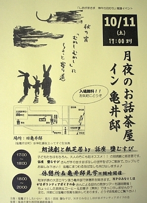 PRにて失礼いたします。 10月10日(金)〜12日(日)の18時30分〜20時30分、神社の境内にて「しおがまさま 神々の月灯り」というイベントが開催されます。 参考:http://www.shiogamajinja.jp/topics/43.shtml これに合わせて、裏坂の亀井邸で休憩所+α「月夜のおはなし茶屋in亀井邸」を下記のとおり開催いたします。 月夜のおはなし茶屋in亀井邸 日時 平成20年10月11日(土)17:00〜20:00 場所 亀井邸 入場無料 17:00〜18:00 朗読劇と紙芝居by話座 鹽むすび 子どもたちはもちろん、大人の