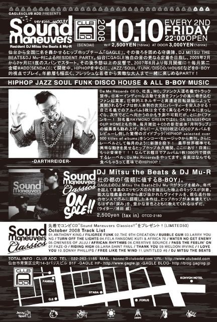 イベントの告知失礼します。 今回は「歩くヒップホップ製造機」ダースレイダー登場!SOUND MANEUVERS至上最もヒップホップ色の強い一夜になる事間違い無し! -every 2nd friday- GAGLE&CLUB ADD PRESENTS "SOUND MANEUVERS" ver.31 -HIPHOP/JAZZ/SOUL/FUNK/DISCO/HOUSE&ALL B-BOY MUSIC- 2008.10.10(FRI) @CLUB ADD(SENDAI) 22:00 : OPEN AT DOOR : 3,000YEN(1D) W/F : 2,500YEN(1D) GUEST LIVE DARTHREIDER(DA.ME.RECORDS CEO) LOCAL LIVE BREATHPOD(MONO m.i.c&DJ SERITA) RESIDENT DJs DJ MITSU THE BEATS(GAGLE/JAZ