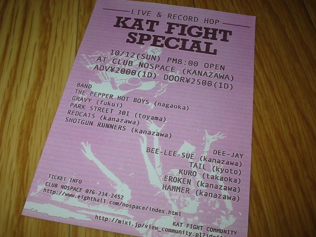 石川県金沢市を拠点に定期開催を行っているDJイベント『KAT FIGHT』が開始以降初となる スペシャル・ライヴ・イベントを開催。あなたは時代の目撃者となる! ≪KAT FIGHT SPECIAL≫ 2008.10.12(SUN) pm8:00−ROCKIN’ ALL NIGHT AT CLUB NOSPACE http://www.eighthall.com/nospace/index.html ADV¥2000(1D) DOOR¥2500(1D) BAND THE PEPPER HOT BOYS (nagaoka) REDCATS (kanazawa) PARK STREET 301 (toyama) GRAVY (fukui
