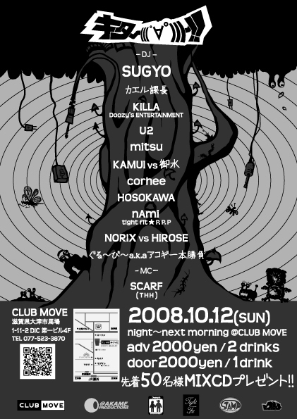 キター(((゜∀゜)))‐!! 2008.10.12(日,祝前) PM 10:00 START 前売り \2,000(W2D) 当日\2,000(W1D) ※先着50名様にMIXCDプレゼント -DJ- SUGYO K-SUKE KILLA(Doozy's ENTERTAIMMENT) U2 mitsu KAMUI vs 御水 corhee HOSOKAWA nami(tight☆fit.P.P.P) NORIX vs HIROSE ぐる〜び〜a.k.aアコギ一本勝負 -MC- SCARF(THH) 詳しくはCLUB MOVEのサイトをチェック!! http://clubmoveschedule.blog.shinobi.jp/ KOOL EYEZ HYBRIDに出演していただいたヤバイDJ陣も登場! 『キ