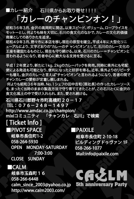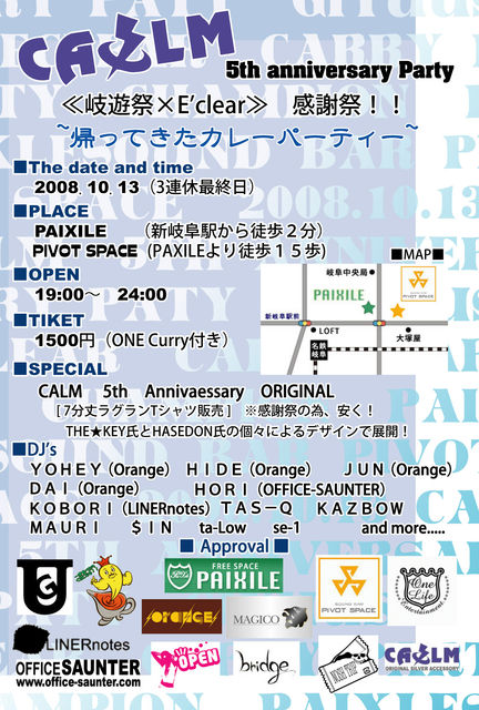 CALM 5th anniversary Party!!!!!! ≪岐遊祭×E’clear≫ ■The date and time 2008.10.13(3連休最終日) ■PLACE PAIXLE & PIVOT SPACE ■OPEN 19:00〜 24:00 ■TIKET 1500円(ONE Curry付き) ■ DJ’S YOHEY (Orange) HIDE (Orange) JUN (Orange) DAI (Orange) HORI (OFFICE-SAUNTER) KOBORI (LINERnotes) Q−TIK ATACOCO ISHIHARA TAS−Q KAZBOW MAURI $IN ta-Low se-1