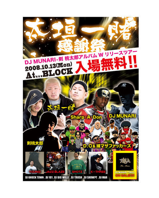 "大垣一賭感謝祭"!!!入場料無料!!! 10月13日(祝日)岐阜CLUB BLOCK 10月25日のSUPER STAのチケットお持ちの方 テキーラGirlによるテキーラ付 CAST DJ MUNARI featSHARP-A-DON(from NYC) 剣桃太郎 D.O & 練マザファッカーズ 大垣一賭 K-THREE YOUNGI JAZZY BLAZE SHOTZ DJ 101 KNOCK TOWN TRUSH BIG WILLI SHOW-T TOTAL INFO/ 会場: CLUB BLOCK (岐阜県岐阜市柳ヶ瀬通1-7 三越ビル3F) TEL : 058-264-2268