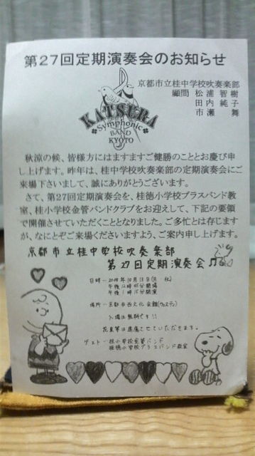 午後12時45分 開場 午後1時15分開演 入場 無料 今年も桂小学校金管バンドと、桂徳小学校ブラスバンド教室を迎えて開演されます。 ご多忙とは存じますが何卒 ご来場くださいませと おハガキをいただきました。 桂中学校吹奏楽部は、定期演奏会に行きアンケートを書くと 年賀状や演奏会の案内のハガキを ご丁寧にも送ってくださいますよ。