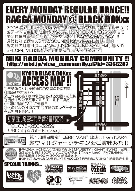 『RAGGA MONDAY』 2008.10.13(MON) @京都BLACK BOXxx 京都市中京区河原町通り三条下る二丁目山崎町236-2ルミエール・ド・三条ビル4F START 22:00 CLOSE5:00 WOMEN \1000 w1d MEN \1500 w1d 【2nd MONDAY REGULAR】 GIANT SWING 【SOUND】 EVER RISING ALLIGETOR 【EARY SELECTION】 TAKAMAN