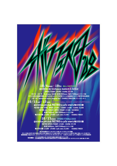 京都発!京都が世界に誇るインディペンデントな大規模イベントの草分け的存在の「ボロフェスタ」! 2008年は、西部講堂を飛び出し、熱量をさらに増幅しながら、より京都の街中へと舞台を移し、同時多発的に開催!鴨川河川敷、CLUB METRO、cafe etw、livehouse NANOの各会場で楽しくて、にぎやかで、濃いイベントが開催されます! 6〜13日の8日間の開催!総勢100組近くの出演アーティスト!などなど今年も何が起こるか分からないドキドキ感あふれる展開、京都のミュージックシーンから立ち上がった圧倒的な音楽の祭典! このイベントの最