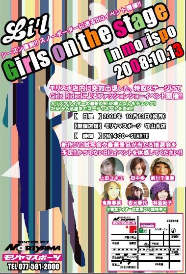 管理人様イベント告知失礼します。 シーズン直前!! スノーボーダーに送る超BIGなイベント!! 「☆ Girls on the Stage ☆」 ---- ---- ---- ---- ---- ---- モリスポ店内に突如出現した、特設ステージに、てGirlsライダーによるファッションショーイベント!! DJによる音と照明の中、カリスマライダー達が最新のWEARの着こなしを魅せてくれますっ!! GEARから私服までライダーコーディネイトを盗んじゃいましょう!! また、新作DVDの試写会や豪華景品が当たる抽選会を予定!! かつてないBIGイベントを体感してください!
