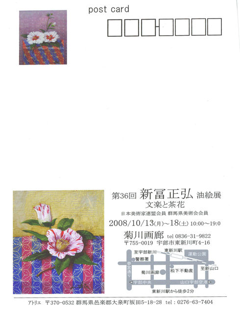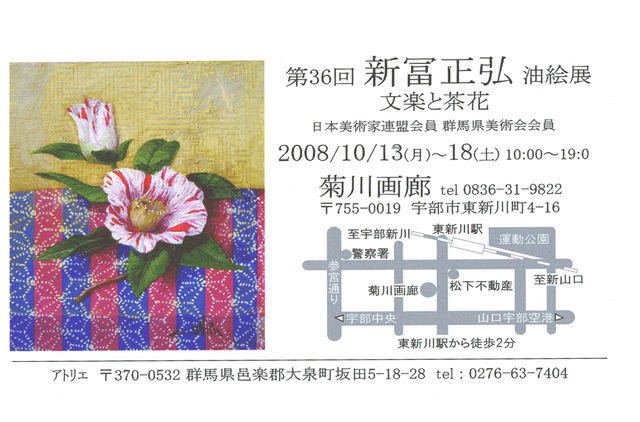 いつもお世話になっております。 (元帥様:不都合でしたらご遠慮なく削除ください。) 宇部市藤山中、中央高校出身です。 第36回 新冨正弘 油絵展 文楽と茶花 2008/10/13(月)〜18(土) 10:00〜19:0 菊川画廊 tel 0836-31-9822 〒755-0019 宇部市東新川町4-16 http://mixi.jp/view_diary.pl?id=892329950&owner_id=3289726
